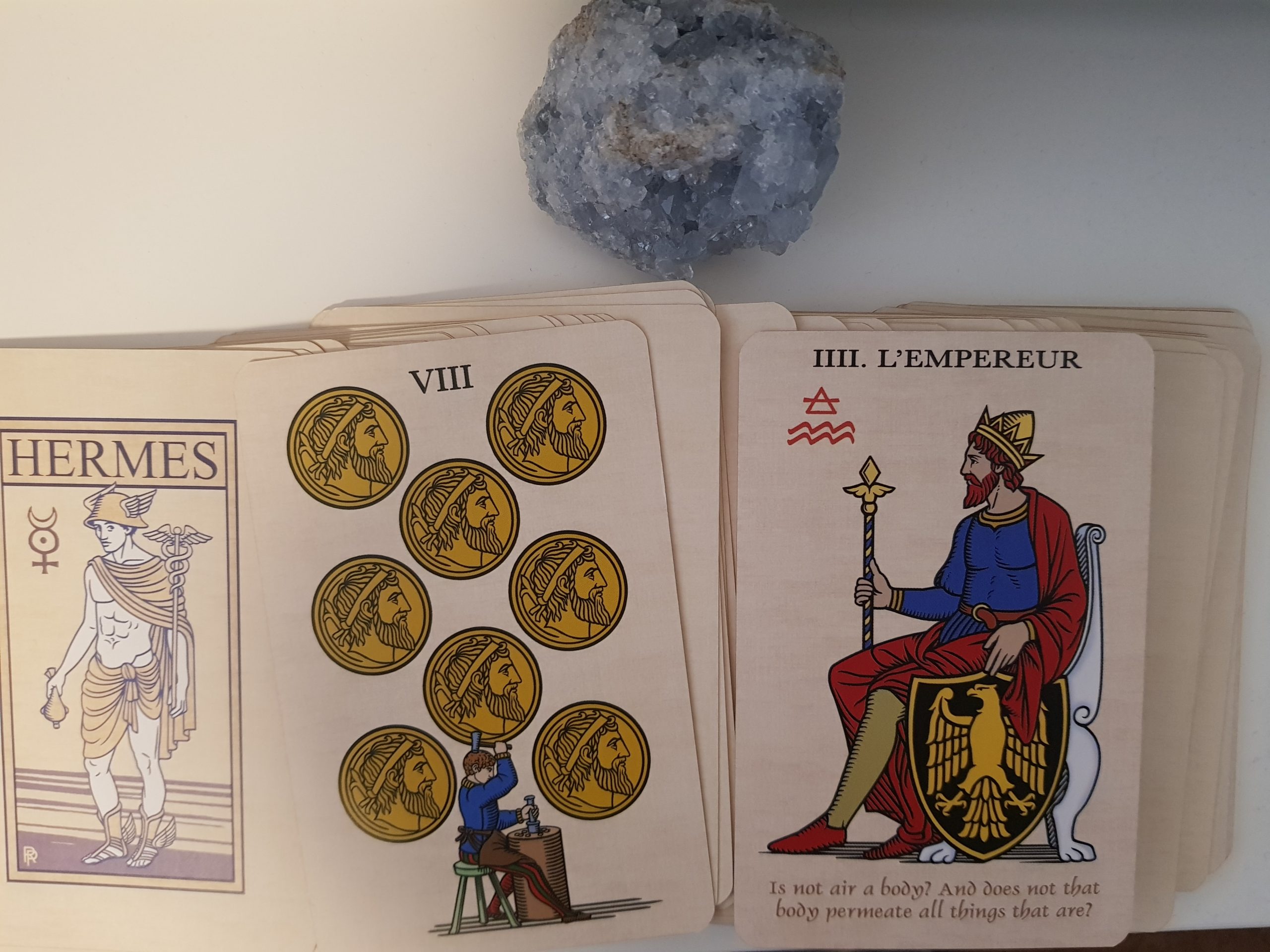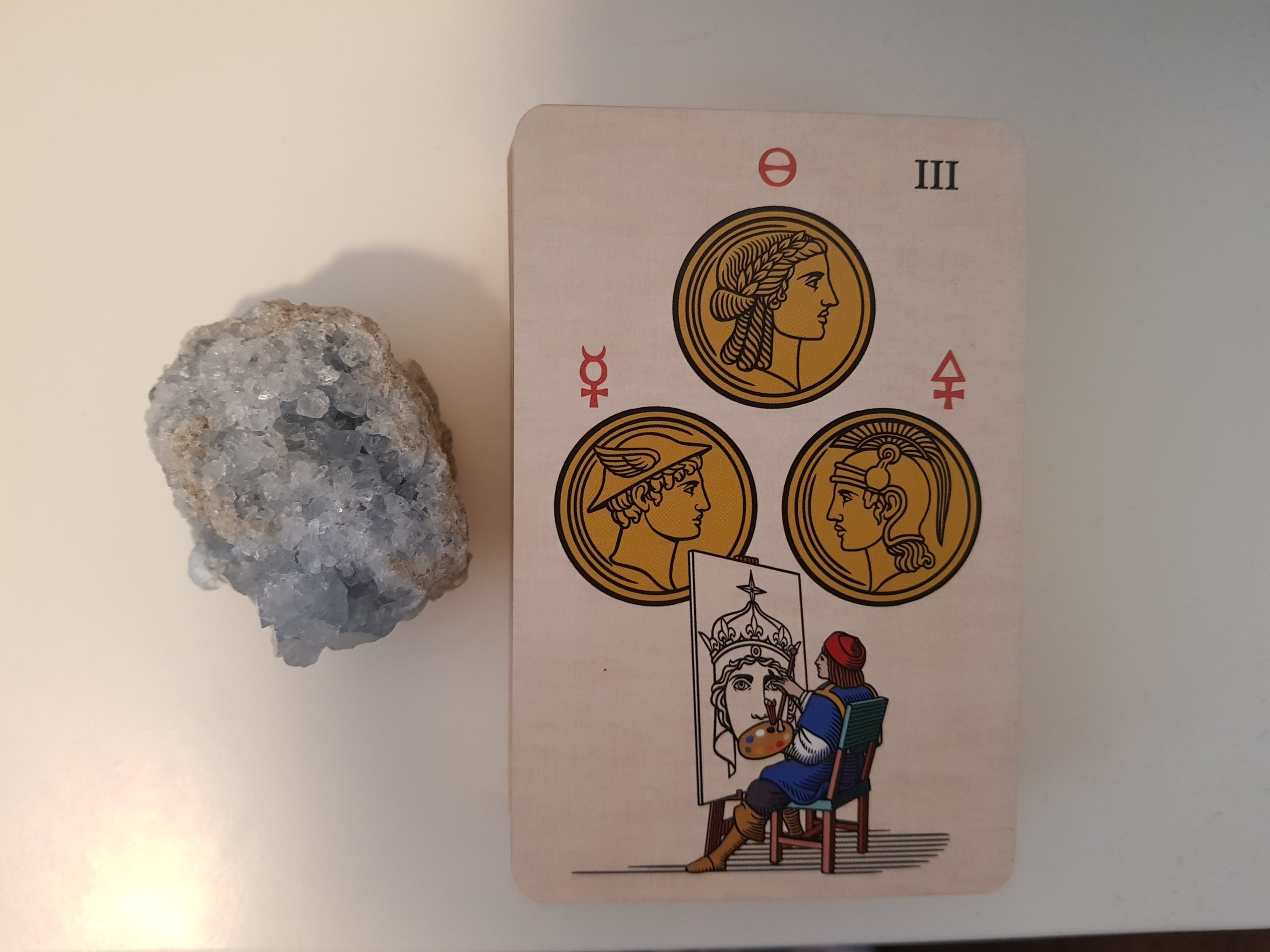 I drew 8 of Pentacles and The Emperor (following me from time to time) as the main cards and the shadow card was 3 of Pentacles from the Alchemical Tarot of Marseille by Robert M.Place. (with special thanks to Robert M. Place for giving me the permission to put the photos of his cards for reading purposes😊🙏🌺)
