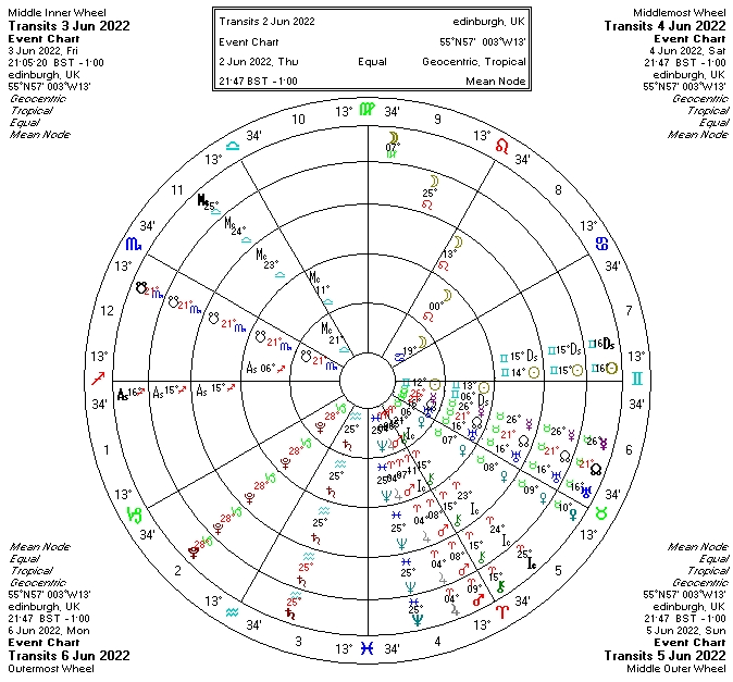 (And ‘yes of course’ in my case, I couldn’t find out how I might make this animated chart work so I made a quinquiwheel (5 wheels) chart showing the stage from stationary direct of Mercury until retrograde motion of Saturn)