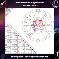On 04/06 at 04:40 UK time, there will be a Full Moon in Sagittarius meaning that Moon in Sagittarius (13°17’) will be opposing the Sun in Gemini (13°17’).