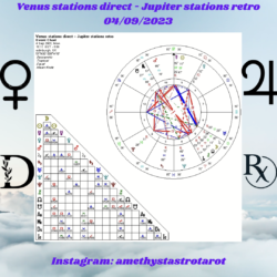 Tomorrow (04/09) is a big day in the world of retrogrades. As Venus will be stationing for direct motion at 02:20 UK time (Leo 12°12’), Jupiter will be stationing for retrograde motion at 15:11 UK time (Taurus 15°34’) keeping the number of retrograde planets the same😊))
