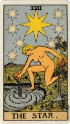 When I was thinking about the association between Aquarius and the Star card, I felt that the connection lies more on the depiction rather than the actual meaning of the card. First of all, there is the water bearer symbolism which is Aquarius. There is number 17 which is 1+7=8 Saturnian energy which is one of the co-ruler planets of Aquarius. And I don’t know if I am reading into that too much but when the water is poured with both hands, the right hand one goes into the water and the other goes on the ground. The first part goes well with the humane Aquarius giving out to the community, having a share but the left hand action is more like still making things flourish that will end up in the main water but from a different perspective maybe the eccentricity and also the independent trait that is expressed with Uranus in Aquarius…